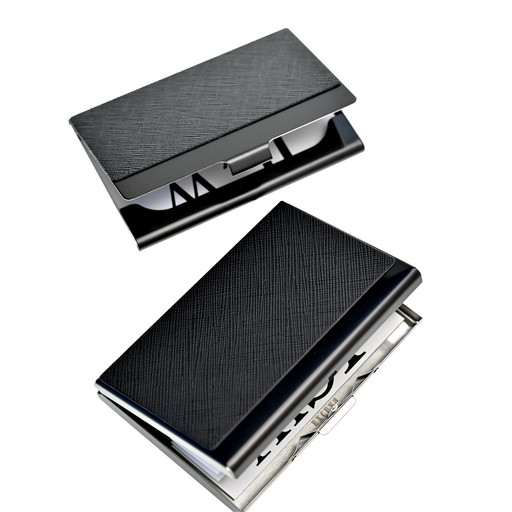 All black natural cowhide steel business card case card holder with initial engraving